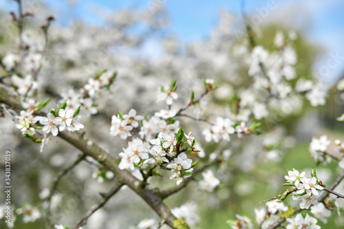 © boomeart, Fototapeta premium Close up view of blooming tree branch with white flowers waiving on wind