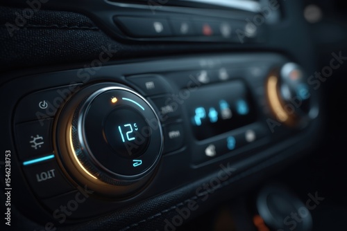 © SMK, Fototapeta premium Close-up view of car climate control system displaying temperature settings and controls illuminated in blue light during nighttime