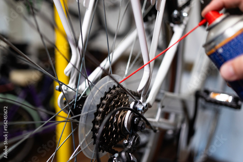 Fototapeta premium Close up view of chain and gear shifter lubrication in bicycle service workshop.