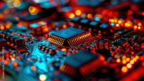 © soha, Fototapeta premium Close-Up View of Colorful Circuit Board with Chips and Lights