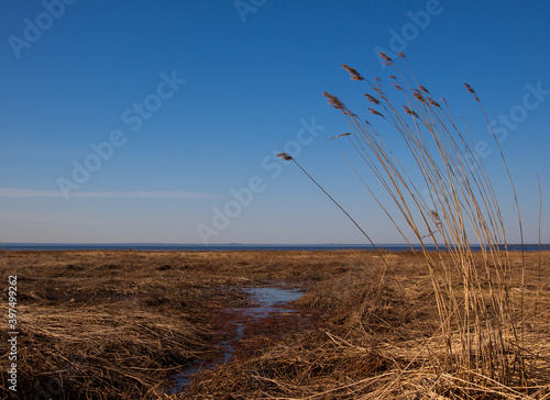 Obraz premium Close up view of colorful reed at spring time. Blue sky and yellow swamp...