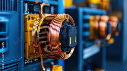 © JK_kyoto, Obraz premium Close-up View of Copper Winding on Industrial Equipment and Machinery in a Modern Manufacturing Facility