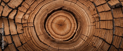 © AkuAku, Fototapeta premium Close-up view of cork tree cross-section highlighting the intricate texture and growth rings of aged wood in natural setting.