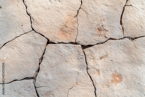 Obraz premium Close-up view of cracked, light-colored stone surface with visible fissures.