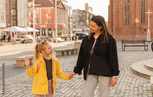 © Look!, Naklejka premium Close up view of cute mom and her daughter walking by hand on the street .