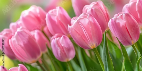 Fototapeta premium Close up view of cute pink tulips, showcasing vibrant spring pink flowers that brighten any setting with their delicate beauty, making these pink tulips a perfect addition to floral collections.