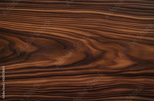 © zhuan, Naklejka premium Close-up view of dark brown wood grain texture with wavy natural patterns and rich variations in color