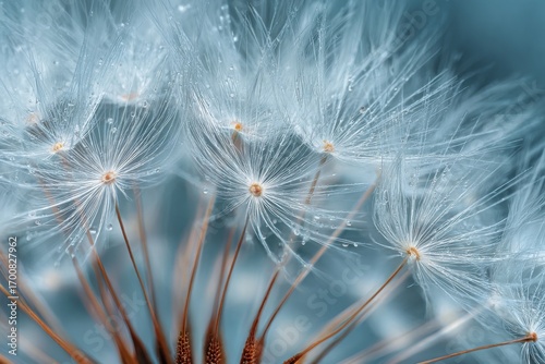 © Ілона Kozlovska, Obraz premium Close-up view of delicate dandelion seeds with water droplets