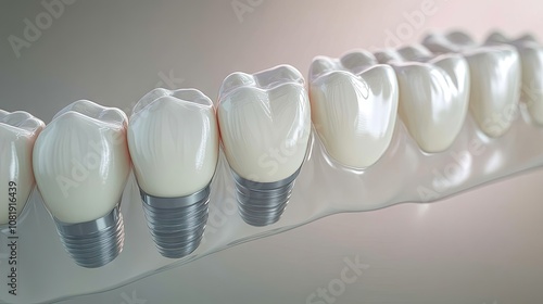 © Nathan, Fototapeta premium Close-up view of dental implants showcasing realistic artificial teeth in a row.