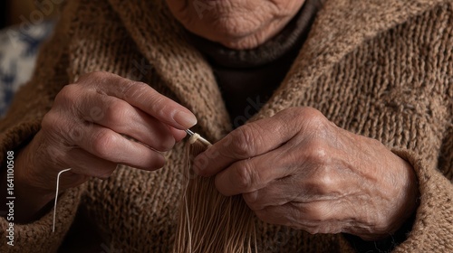 Fototapeta premium Close-up view of elderly hands engaged in needlework.