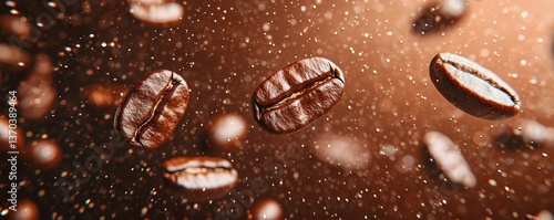 Fototapeta premium Close-Up View of Falling Coffee Beans with Light Bokeh Effect Against a Warm Brown Background