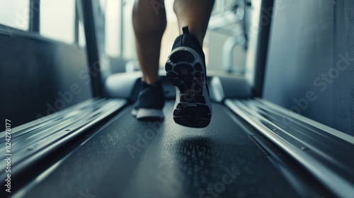 © Khoirul, Fototapeta premium Close up view of feet wearing shoes sneakers running on treadmill inside gym studio. Sport gym background.