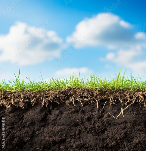 Fototapeta premium Close-up view of fertile soil with grass and roots, beneath a partly cloudy sky