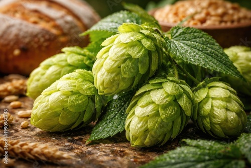 Fototapeta premium Close-up view of fresh green hop cones essential for brewing beer and baking...
