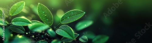 Obraz premium Close-up view of fresh green leaves with dew droplets, showcasing vibrant...