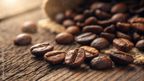 Naklejka premium Close-Up View of Freshly Roasted Coffee Beans on Wooden Surface