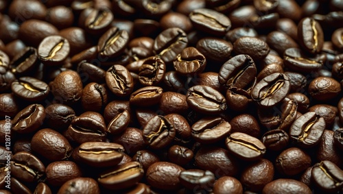 Fototapeta premium Close up view of freshly roasted coffee beans showcasing rich textures and...