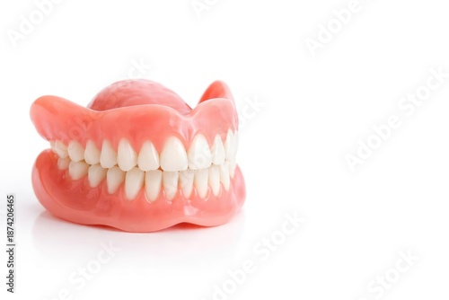 © Rizvan, Fototapeta premium Close up view of full denture set isolated on white background with dental care copy space