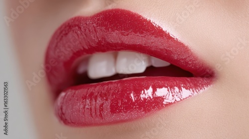 © Alex, Obraz premium Close-up view of glossy red lips showcasing beauty and makeup artistry in a modern setting during daylight