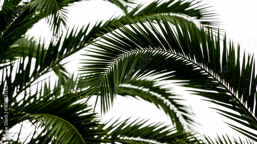 Fototapeta premium Close-up view of green palm fronds against a bright sky