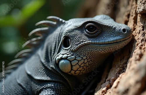 © Pete, Fototapeta premium Close up view of grey monitor lizard head on tree bark. Reptile with scales and spines looking intently, showing its eye and nostril. Wildlife animal in natural habitat.