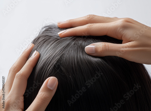 Fototapeta premium Close-up View of Hands Gently Massaging Scalp, Highlighting Healthy Dark Hair