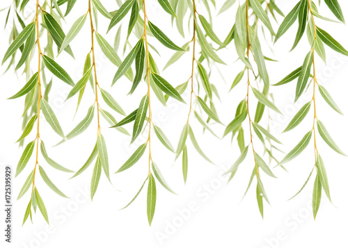 © CHAOURRI, Fototapeta premium Close up view of hanging willow branches with green leaves against a black and white background