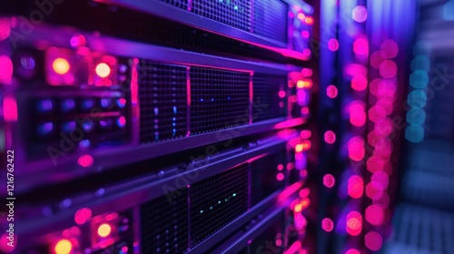 Obraz premium Close-up view of illuminated server racks in a data center with vibrant LED...