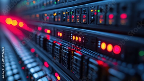 Fototapeta premium Close-up view of illuminated server racks showcasing data processing...