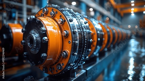 © zulie, Obraz premium Close-up view of industrial machinery in a factory with metal parts and gears.