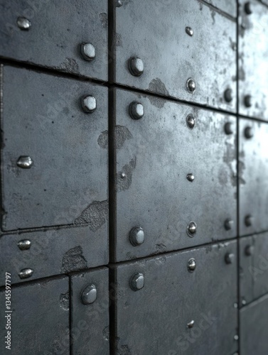 Fototapeta premium Close-up view of industrial metal wall panels showcasing rivets and surface...
