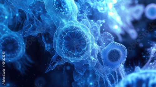 Obraz premium Close-up view of intricate bacterial structures highlighted by a glowing blue...