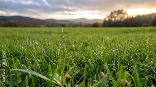 Fototapeta premium Close up view of lush green grass with beautiful scenic backdrop at sunset in...