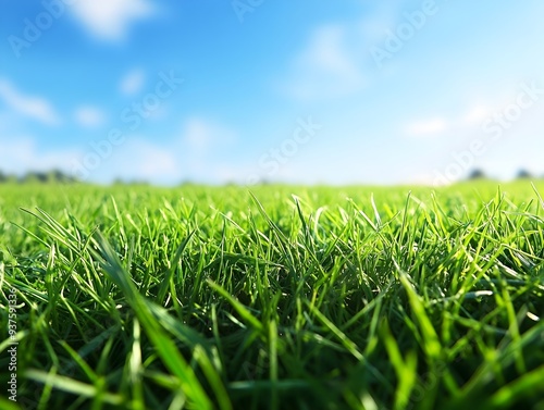 Fototapeta premium Close up view of lush vibrant green grass with a bright blue sky and fluffy...