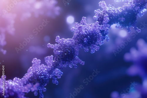 Fototapeta premium Close up view of molecular RNA chain surrounded by viruses highlighting interaction at the microscopic level. Generative AI