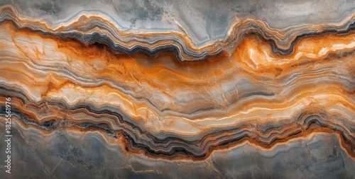 Fototapeta premium Close-up view of multi-layered natural stone with orange, gray, black, and beige wavy patterns and textures