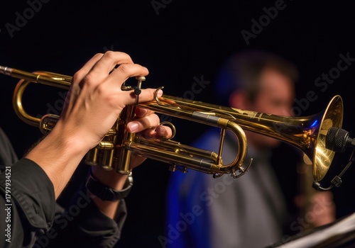 © Andrey Myagkov, Obraz premium Close-up view of musician's hands playing a shiny brass trumpet during a live performance