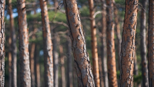Fototapeta premium Close-up view of pine tree trunks in a forest showcasing textures and the natural beauty of pine bark in a serene outdoor setting.