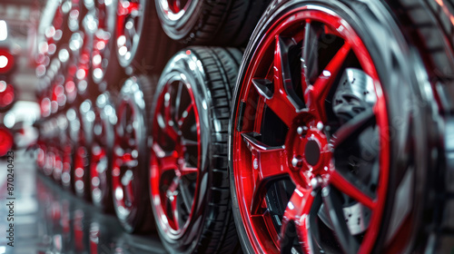 © redflower, Fototapeta premium Close-Up View of Premium Sports Rims Stacked in Car Tire Store