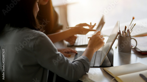 Obraz premium Close up view of professional designer team using digital tablet in simple co working space