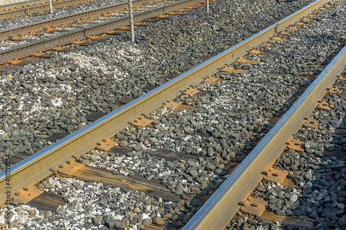 © Chandra, Naklejka premium Close up view of railroad tracks at ground level