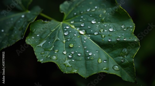 Fototapeta premium Close up view of raindrops on green leaf. Generative AI