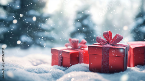 © pixelliebe, Naklejka premium close-up view of red christmas gift boxes on snow in a blurred winter forest during snowfall