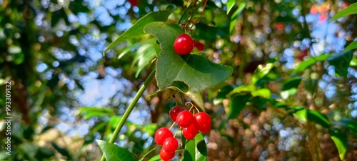 © Hocineharoun, Obraz premium close up view of red currant and red berries on forest tree in Annaba. Algeria