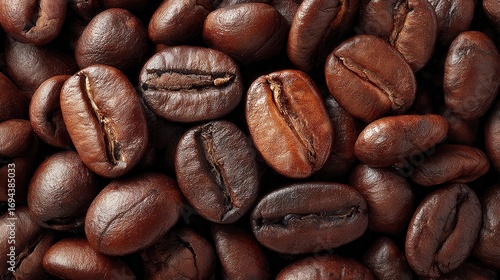 © isz, Naklejka premium Close-up View of Rich Dark Roasted Coffee Beans on a Wooden Surface