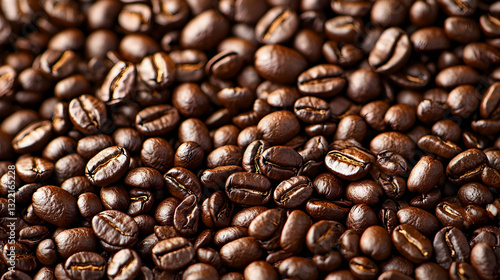© Fadil, Naklejka premium Close Up View Of Roasted Brown Coffee Beans With Rich Texture And Aromatic Flavor Ideal For Background Or Food And Drink Concepts
