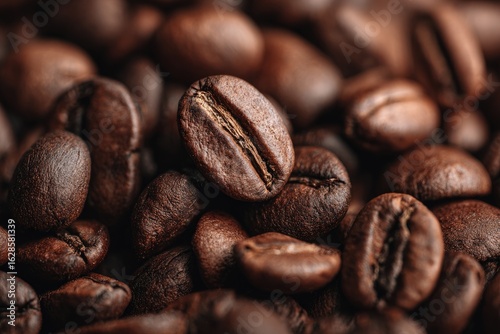 © Sanrobone, Naklejka premium Close-up view of roasted coffee beans. A single bean is slightly elevated, emphasizing its texture and rich brown color. Many other beans are densely packed in the background