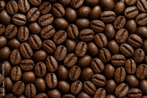 © diproduction, Naklejka premium Close-up view of roasted coffee beans arranged in a seamless pattern with detailed texture on a dark background, emphasizing food and creative visuals. Ai generative