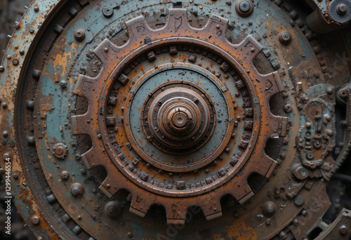 © skdesign, Fototapeta premium Close-up view of rusted gears and machinery parts, showcasing signs of neglect and disrepair