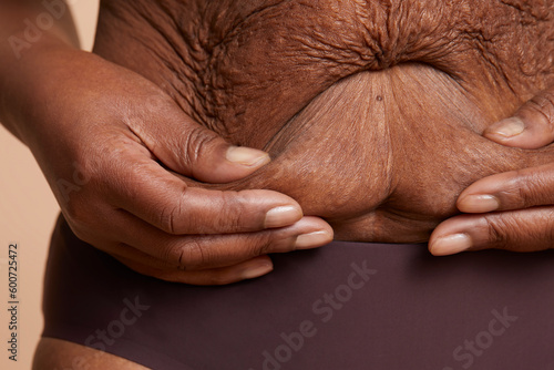 Fototapeta premium Close-up view of senior woman touching wrinkled belly